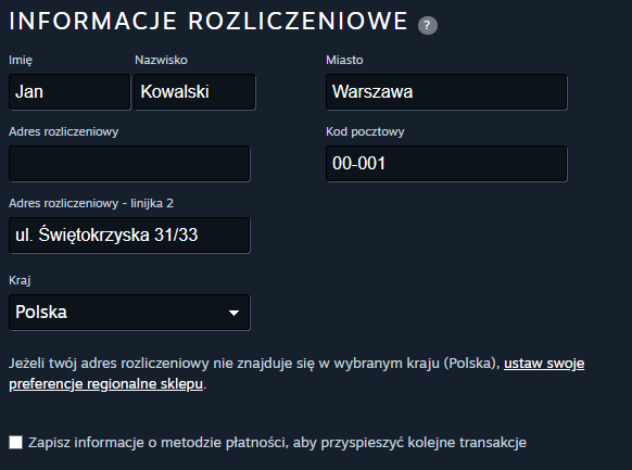 Co należy wpisać w adresie rozliczeniowym na Steam?
