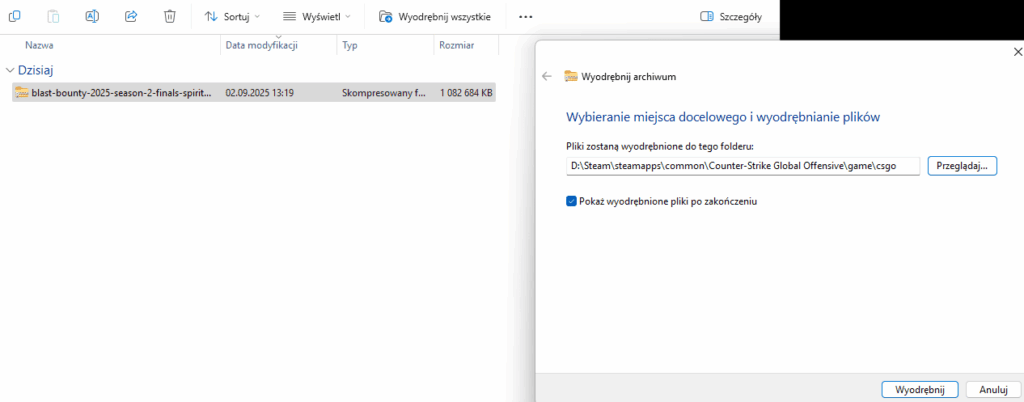 Steam\steamapps\common\Counter-Strike Global Offensive\game\csgo. Ścieżka zależna jest od dysku, gdzie zainstalowaliście Counter-Strike 2. - Przy rozpakowywaniu można wybrać miejsce, gdzie plik znajdzie się po rozpakowaniu. Warto wtedy wybrać wyżej przedstawioną ścieżkę.