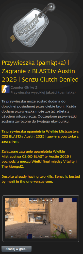 W końcu, dostaliśmy to, co było wygrzebane z plików gry jeszcze przed oficjalnym startem majora. Czyli zawieszki z highlightami meczów na broniach souvenir. Każda broń zdobyta z paczek z pamiątką z fazy playoff posiada własną zawieszkę, która upamiętnia losowy highlight z danej mapy. Highlightów jest dużo, bo aż 492, link do pełnej listy w tym Tweecie. Z czego możemy zobaczyć świetny ace Usukhbayar „910” Banzragcha na Mirage przeciwko Vitality lub jak Dan „apEX” Madesclaire przywitał fanów w Austin przed finałem.