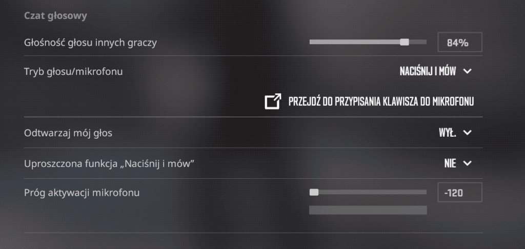 - Tryb głosu/mikrofonu – wybór między Push-to-Talk (naciśnij, aby mówić) a aktywacją głosem.