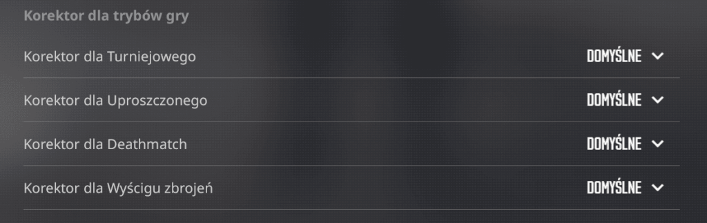 Counter-Strike 2 daje możliwość przypisywania osobnych ustawień korektora do poszczególnych trybów gry. Dzięki temu możesz dobrać inny rodzaj korektora dla trybu Deathmatch jak i trybu turniejowego. Dostępne są aktualnie cztery osobne ustawienia korektora: Dla trybu turniejowego, uproszczonego, deathmatch i wyścigu zbrojeń