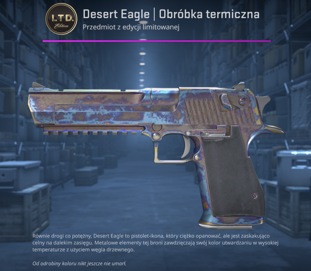 Jest to przedmiot, dostępny w przepustce zbrojowni przez ograniczony czas. Dotychczas mieliśmy okazję zdobyć 2 takie przedmioty – Desert Eagle | Obróbka Termiczna i XM1014 | Samotność. Deagle był dostępny przez 103 do 14.01.2025, teraz można go jedynie kupić od innych graczy. Sam Deagle był do wymiany za 25 gwiazdek, a XM jest do wymiany za 15.